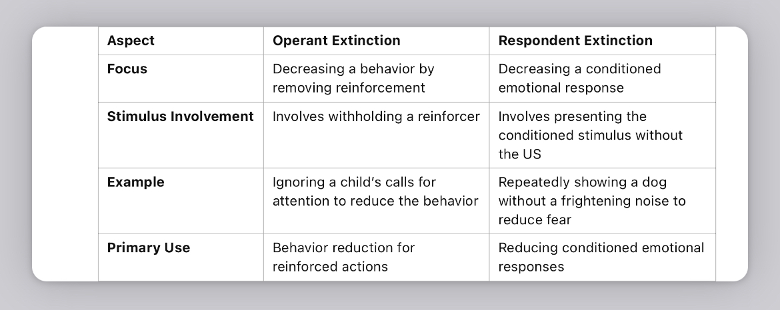 • When to Use: Respondent extinction is used to reduce a learned or conditioned emotional response, such as fear or anxiety. It’s common in therapeutic settings where the goal is to decrease negative emotional reactions by separating the conditioned stimulus from the unconditioned stimulus.