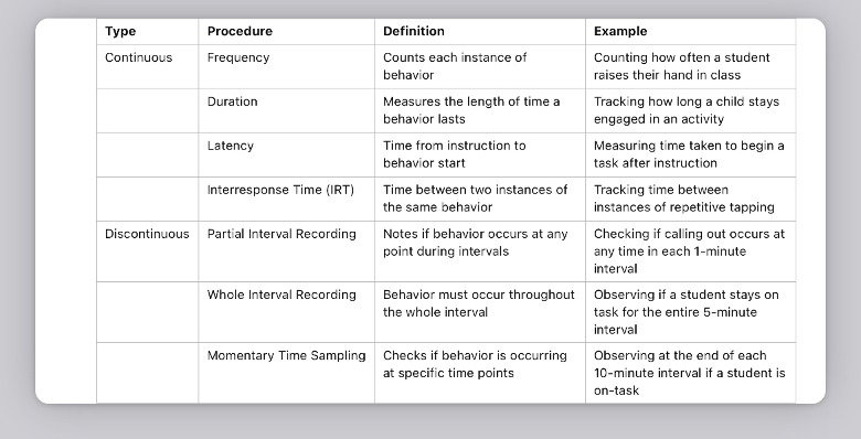 Partial Interval Recording: Observing if the behavior occurs at any time during a set interval. Noting if a student calls out in class at any time during each 1-minute interval, useful for high-rate behaviors.