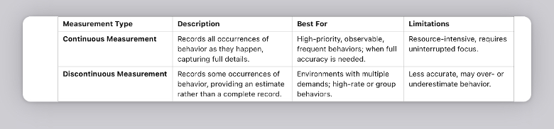 Mastering the distinction between continuous and discontinuous measurement procedures allows BCBAs to choose the most effective and efficient data collection methods for each client and setting. Continuous measurement provides precise data for high-priority behaviors, while discontinuous measurement offers practical solutions in less controlled environments. By selecting the right approach, BCBAs can gather meaningful data to inform intervention decisions and maximize client outcomes.