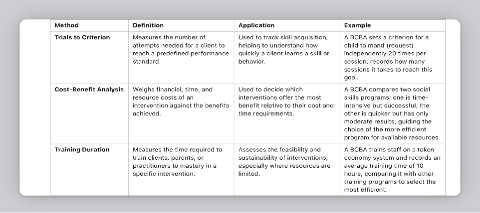 Measuring efficiency is a critical component for BCBAs when implementing and evaluating behavioral interventions. It ensures that interventions are not only effective but also practical and resource-efficient. Efficiency measures help BCBAs make data-driven decisions that maximize the impact of interventions while minimizing time, cost, and effort. Here are key methods for measuring efficiency: