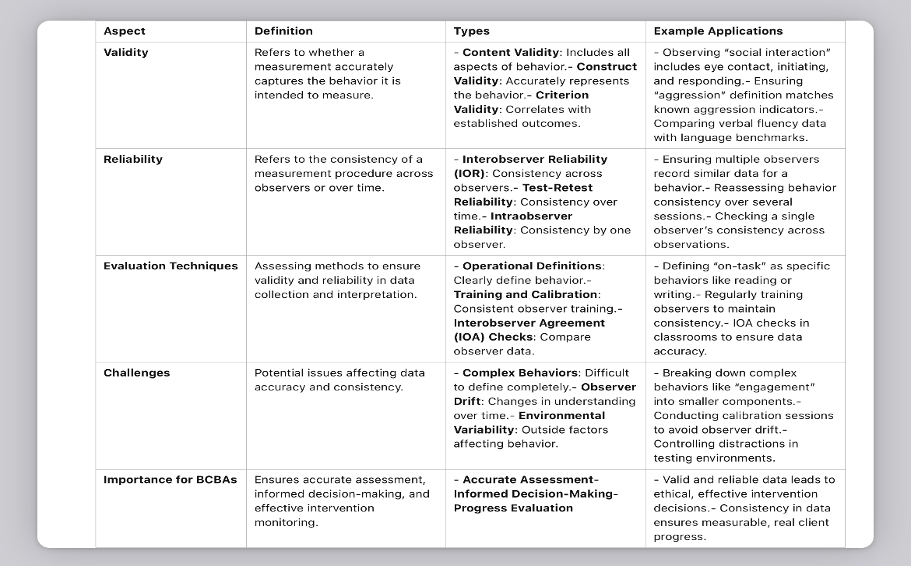 For BCBA practitioners, evaluating the validity and reliability of measurement procedures is essential to ensure that data accurately represents the behavior being studied and is consistent across time and observers. Here’s an in-depth look at these concepts and how they are applied in behavior analysis: