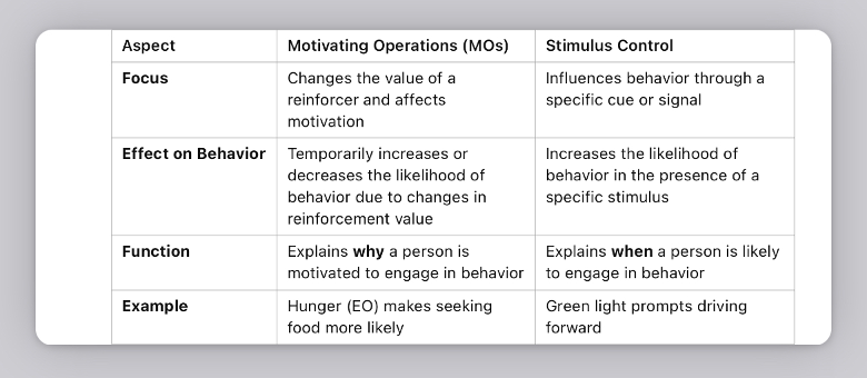 Motivating Operations (MOs) and Stimulus Control are both important concepts in behavior analysis, but they serve different functions in influencing behavior. Here’s a breakdown of each concept and the key differences between them: