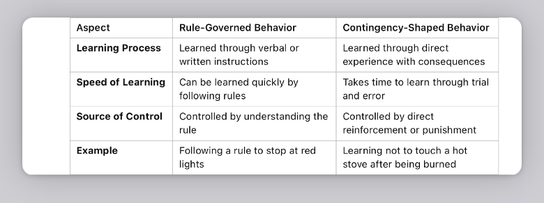 Rule-Governed Behavior and Contingency-Shaped Behavior are two types of behavior influenced by different learning processes. Here’s an overview of each and how they differ: